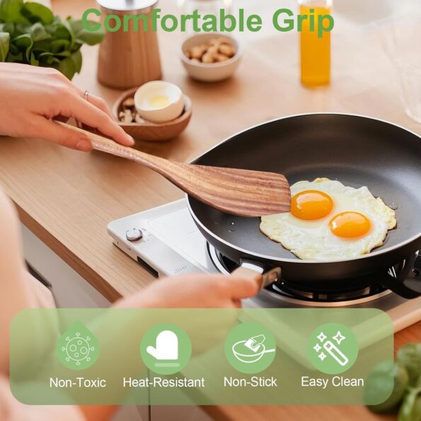 - NON-SCRATCH & HEAT RESISTANT: These wooden spatulas are gentle on the surfaces of your non-stick pans and other cookware, ensuring they do not scratch or damage them. Our wooden cooking spoons do not conduct heat efficiently. This makes them exceptionally safe to handle even at high temperatures, allowing you to stir, flip, and serve with confidence without concerns about burns or heat transfer.