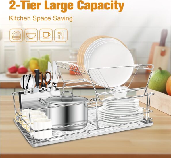 - 【2-Tier Design】 2 tier large capacity dish drying rack to store different types and sizes of kitchen utensils, ideal for kitchens with limited space.