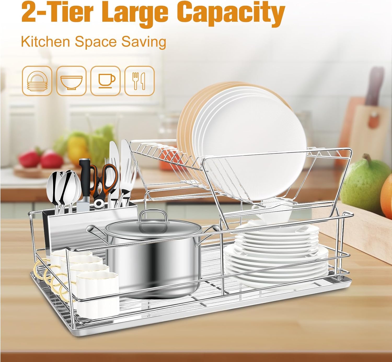 2TierDishDryingRackforKitchenCounter,StainlessSteelLargeCapacityDishRackwithDetachableDishDrainerOrganizer,UtensilHolderandDrainBoard