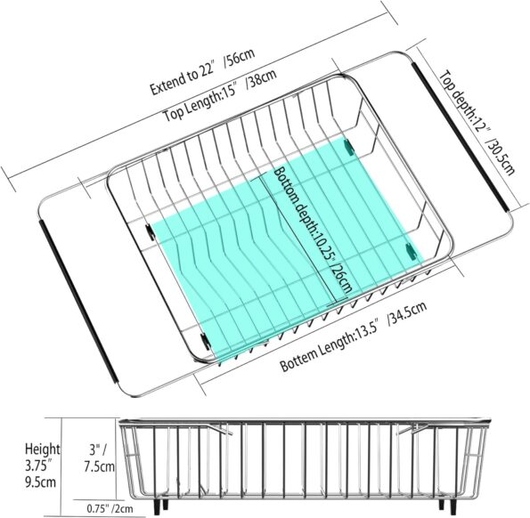 - SIZE DETAILS – Please check the picture 2. Drain basket Height:3.75″. length and depth of top of basket:15in x 12in, Length and depth of bottom of basket:13.5in x 10.25in ; Drain basket arm extends 15 to 22 inches long and it can place over the sink measuring between 16 to 22 inches and more than 12.5 inches deep. With extendable arm, it can be used over the sink, on the countertop or in the sink to save space in compact kitchens.