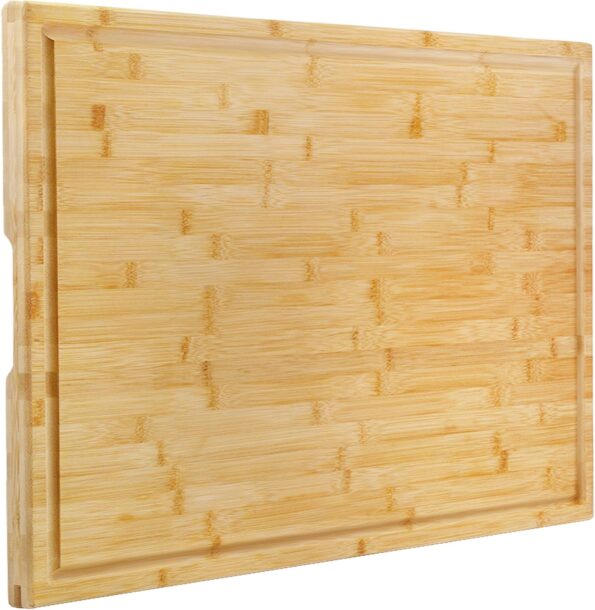- Organic Bamboo: Extra large cutting board are made of organic bamboo, very durable bamboo construction makes it hard to scar a bamboo cutting board with a knife and at the same time its soft nature does not damage or blunt your knives. The cutting board has adopted a crisscross design, which contributes to reducing the occurrence of cracking