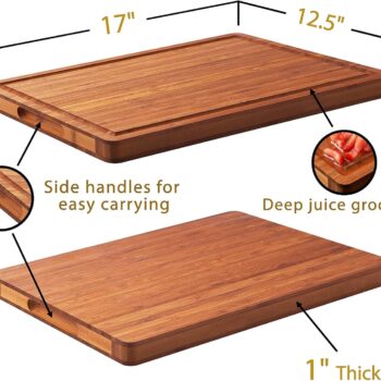 - Extra Large & Tough: large wood cutting board with juice groove has an extra large smooth surface size of 24L * 16W inches, to ensure enough space for your daily kitchen use. Our large cutting board is 1.25inch thick, does not deform even after long-term use.